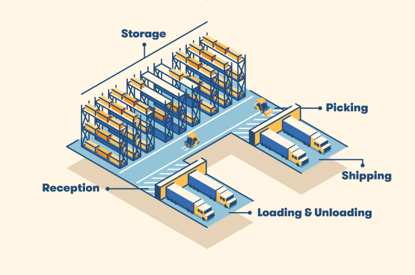 - Receiving → storage → picking → packing → shipping